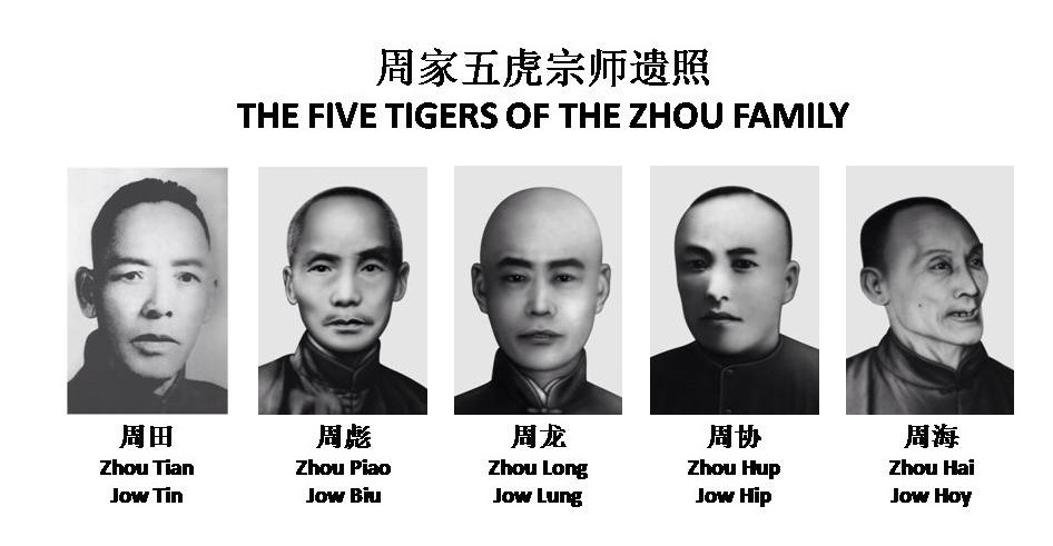 二十年代岭南武林稱為周家五虎,享譽達半世紀。 周家拳創于清末民初,當時武林稱此拳派為洪頭蔡尾。 拳法創自周龍,乃參合洪拳,蔡拳与及北少林有所發明而耒。後流傳廣遠、聲名鼎盛,故為周家拳。 周龍祖師祖籍廣東省新會縣沙富鄉,生于前清光緒十七年,世代務農,鄉中崇尚武藝,周龍幼年即随他叔父周雄習洪拳,首先教以樁步。練洪拳者不倫老少,皆以扎馬為苦,但周龍絕不言苦,周雄更加喜愛,對之另眼相看。一日,周雄召周龍至,告訴他因老病發作,恐不久人世。但尚有絕技八卦棍法,當傳于你。你拳法已不弱,若得八卦,他日將能在武林得一席位。不一個月周龍尽得棍法之長。不久周雄亦病逝。十载淬砺,周龍練得步法穩健,拳勢威猛而剛勁有力,深得洪拳之特色。